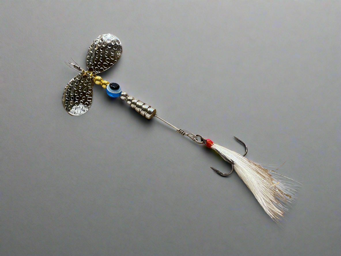Blue eyed, double bladed rooster tail. 20 gauge wire, #2 silver, hammered Colorado blades, followed by a solid brass, zinc coated 0.1oz cylinder. Beneath is a hand tied, #4 white feathered treble.